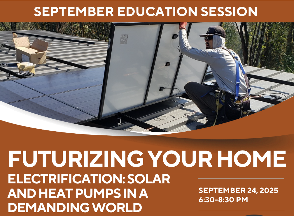 Join us in-person and online on September 24th from 6:30 to 8:30PM for Futurizing Your Home. Our speakers will be Taylor Disch, Solar Power Consultant, who will discuss aspects of residential solar and the status of strategies around the sunsetting Solar Power Tax Credit. Brian Vander Vlies of Sundance Energy Services will share about the latest resources for electric heating and heat pumps along with updates on the state policy to phase out the use of natural gas.