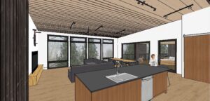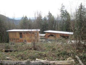 Layout of the house, laundry hook ups, curbless shower, and grab bars allow for aging in place. Shou sugi ban siding and metal roofing virtually eliminate exterior maintenance and allow the structures to blend into the landscape. An indoor climbing wall allows for kids and adults to engage in the sport even in the rainy season. The swimming pool is a converted shipping container heated with solar hot water.