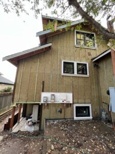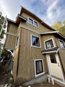 A gas dryer and range were replaced with electrical options. The addition was built with 2×4 walls and ¾” sheeting to mirror the assembly on the existing house and allow us to fasten our rainscreen battens in a sensible layout from the foundation to the roof. We added 1 ½” of rockwool insulation over a Weather Resistive Barrier (WRB) of Adhero, a self adhered membrane that controls air leakage and sheds water.