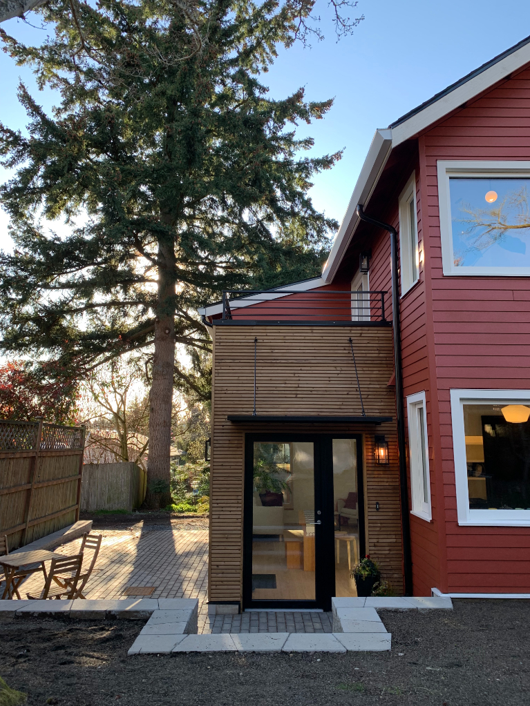 Using BEAM analysis, components were chosen to reduce embodied carbon. This includes all reclaimed 2x framing lumber, cork continuous exterior wall insulation, cellulose cavity insulation, and wood based siding.