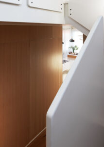 The design features two stories over a basement, maximizing the allowable volume on the site. The upper floor includes a primary suite with an exercise space, both opening onto an upper west-facing deck with a hot tub and breathtaking views of the Olympic range. Two smaller bedrooms share a bath—one featuring a lofted hangout space, while the other incorporates deep storage above. North-facing skylights in the stairwell flood the main floor’s living, dining, and kitchen areas with natural light. Opting for two stories instead of three allowed for higher ceilings in the living spaces and better basement views to the yard. The main floor includes a separate office facing the street, a modest front porch, and a large folding door in the LDK (living, dining, kitchen) area that opens to a deck cascading into a landscaped rear yard and garden.