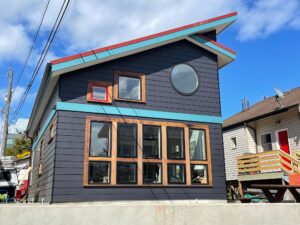 What started as a 700sf footprint with a 300sf loft – with ladder access for the kids and grandkids – soon evolved into a design with a real staircase to a proper second floor with a balcony to the great room… complete with railings from the reclaimed redwood. The roof/envelope shape is indeed bold. One of the site parameters was a power cable requiring the roof shape to be lower at the alley side (West). We chose to create one shed shape rising dramatically to the East and an interlocking shed shape low at the East. Fun to see from both the inside and outside. The design process with these clients was a delightful experience. We met (mostly) via zoom – the clients in Seattle, the homeowners (her parents) in Nevada and the Architect in studioB (aka a tricked out school bus) in South Park Seattle. As the envelope and windowing took shape – Rachael (the daughter) stated that “you have to push out there so that you can come back to something you love”. We did indeed investigate some lively ideas and came back to a balance of boldness and whimsy. There are three complimentary circles that enhance the design and living experience. Much energy was put into the layout to utilize every square foot of living space, the windowing for practicality and creativity, the siding materials, and the overall palette of colors.