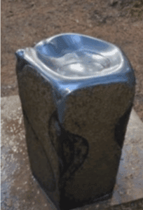 Our Sacristy Piscina (the special sink that empties into the earth for the consecrated communion wine). We contracted with a Native American sculptor to create an aesthetically pleasing outside piscina basin crafted from native basalt stone. It emphasizes the visual and theological connection between the altar of celebration/sacrifice and the earth.