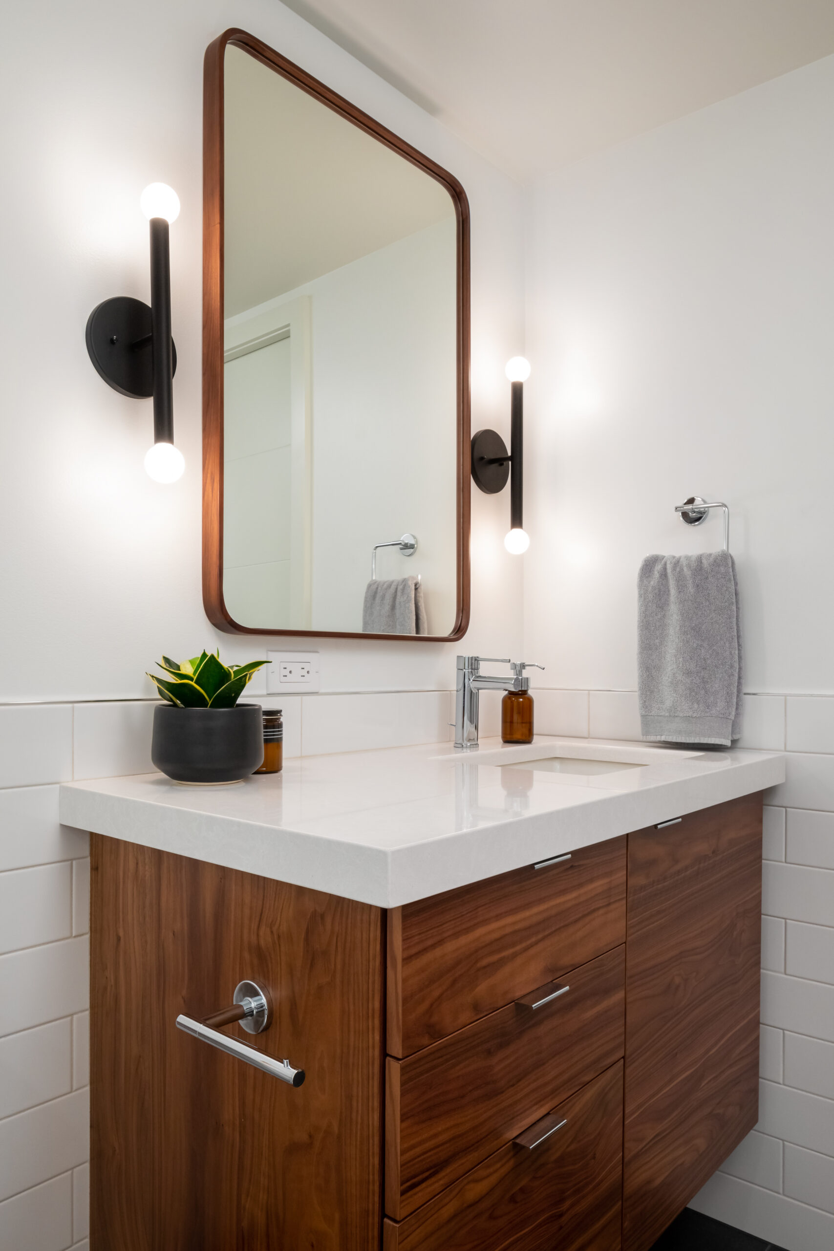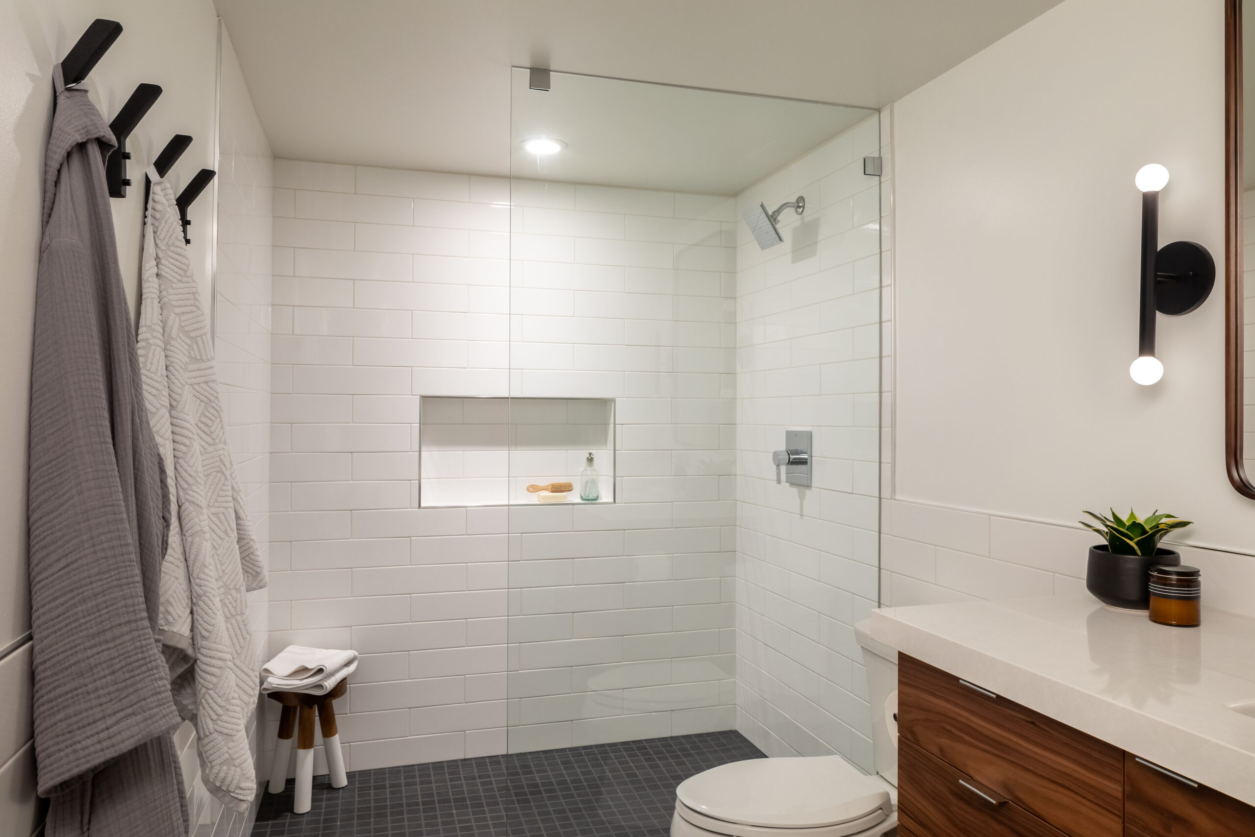 Some aspects of universal design were introduced bringing the bathroom a flush entry shower, access without having to use the stairs, and reducing trip hazards. The bathroom’s tile grout also meets GreenGuard certification and is low maintenance, admitting healthy indoor air and stability in the life of the product.