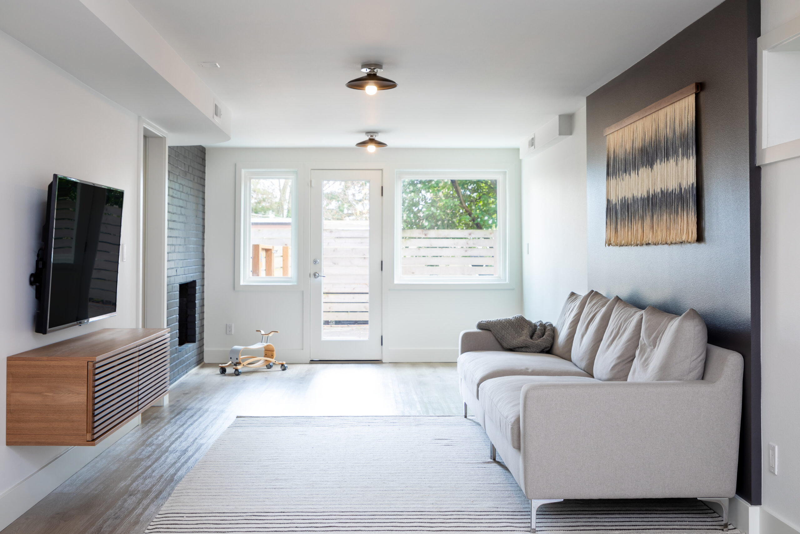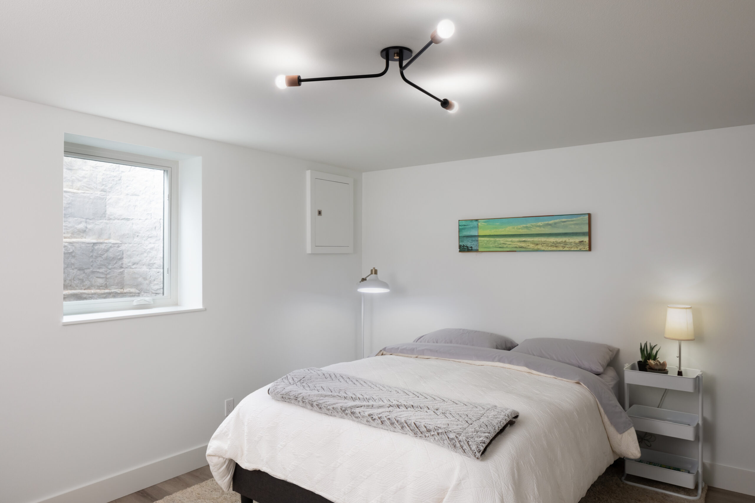 Egress windows were fitted into the bedroom and yoga spaces. Large windows were added on the west-facing side (where there were none before) to bring in far more natural light, making the space more inviting and livable.