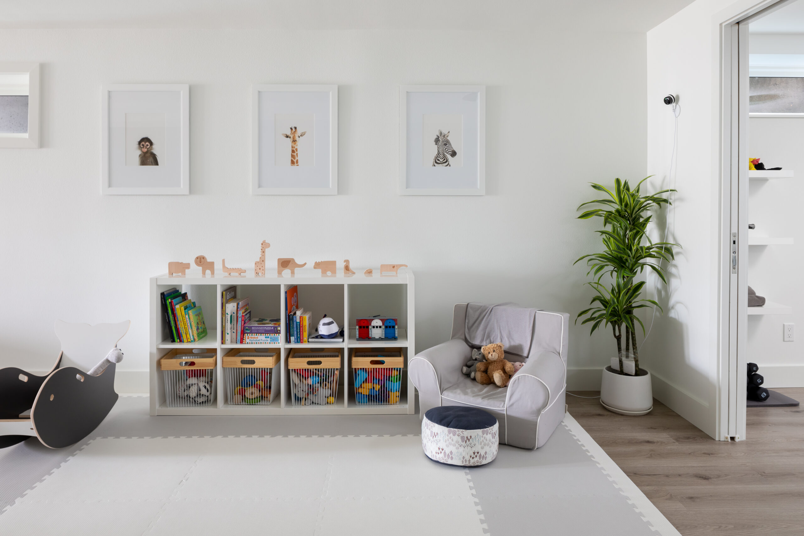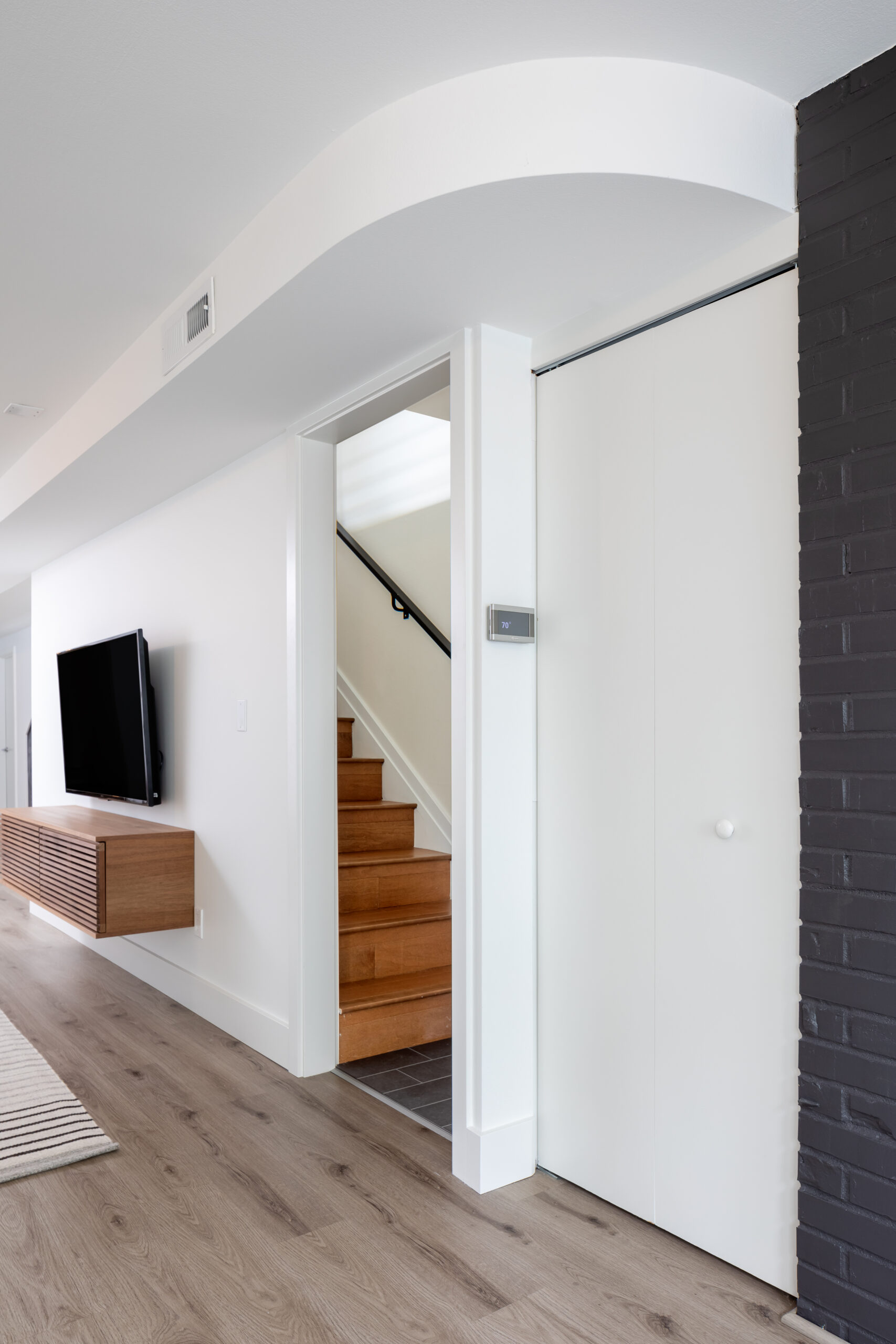 Their toddler daughter inspired mom and dad to update this finished basement. The family sought to create a customized modern space to act as a play and family area, and to build in a full bathroom, while eliminating moisture for best air quality. Natural light was desired for improved wellness and healthy well-being.