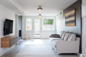 We focused on mitigating moisture from the basement to create a healthy space for the whole family to live and play. The flooring was an important choice as well, being that it was for the basement it needed to be healthy, easy to maintain, and dry.